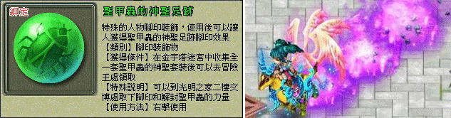 開放聖甲蟲套裝的獎勵-「聖甲蟲的神聖足跡」,當玩家在迷宮中收集五個套件之後可以到明月鎮光明之家的冒險王處領取該腳印 |