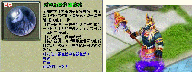 開放阿努比斯的靈魂裝束套裝的獎勵-「特殊幻化石」,當玩家收集五個套件之後,可到冒險王處領取特殊幻化石-「阿努比斯的靈魂珠」 |